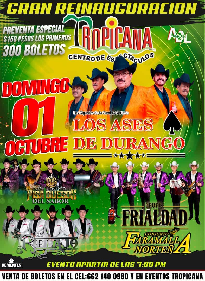 Este próximo domingo primero de octubre, se reinaugurara el centro de espectáculos Tropicana, con la presencia de los gigantes de la cumbia norteña, de Los Ases de Durango, los hermosillenses podrán bailar y divertirse en grande con grupos como Los pisa quesos del sabor, El relajo, Grupo frialdad, así como el conjunto Faramalla Norteña.