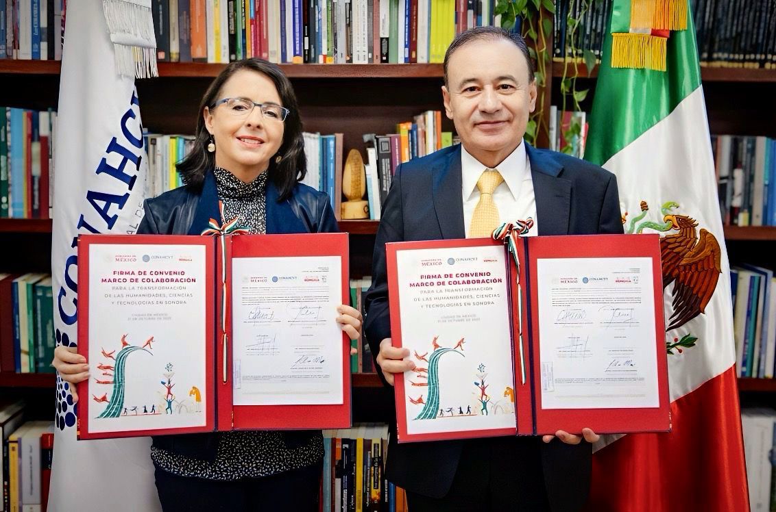 Ciudad de México; 31 de octubre de 2023.- Un convenio de colaboración entre el Gobierno de Sonora y el Consejo Nacional de Humanidades, Ciencia y Tecnologías (Conahcyt), signó el gobernador Alfonso Durazo Montaño en reunión con la directora de la institución, María Elena Álvarez- Buylla Roces, con el objetivo de establecer agendas de trabajo de interés común encaminadas a la investigación humanística y programas de movilidad estudiantil ligados al Plan Sonora de Energía Sostenible.