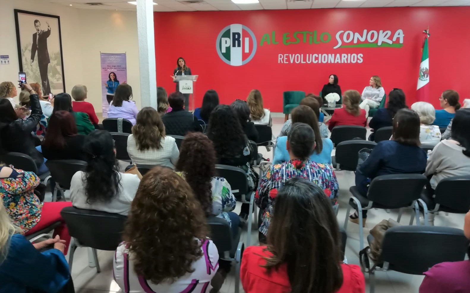 La secretaria de Gestión Social del PRI Sonora, Karmen “Kiki” Diaz Brown Ojeda, hizo entrega de un reconocimiento a Aline Mirazo por su participación en la plática ante mujeres priistas.
