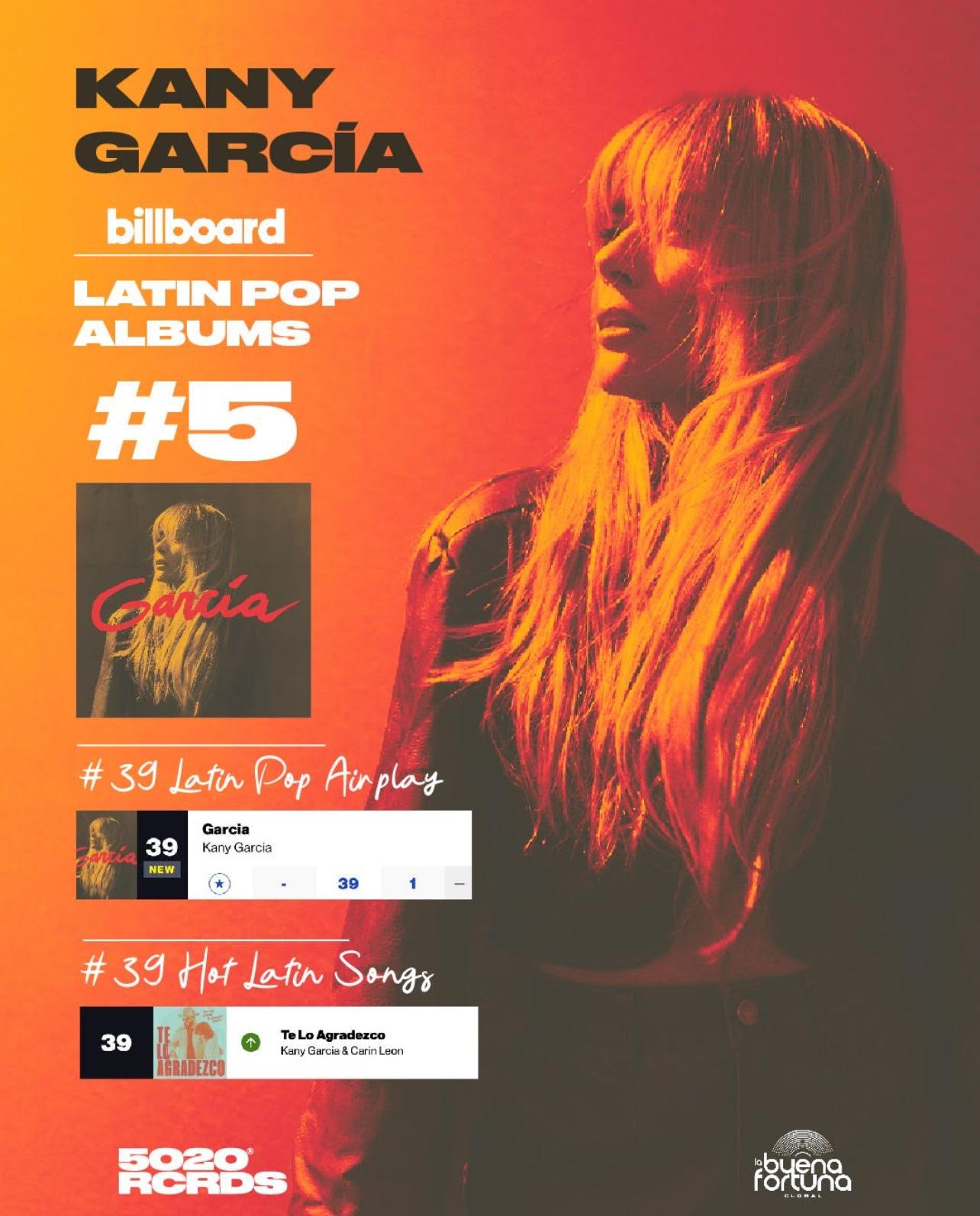 La cantautora puertorriqueña Kany García sigue cosechando éxitos tras el lanzamiento de su último álbum “García”. Este estreno ha logrado destacarse en las prestigiosas listas de Billboard, debutando en el puesto número cinco de Latin Pop Albums y en el puesto número 39 de Latin Pop Airplay, consolidando a Kany García como una de las artistas más influyentes de la música latina contemporánea.