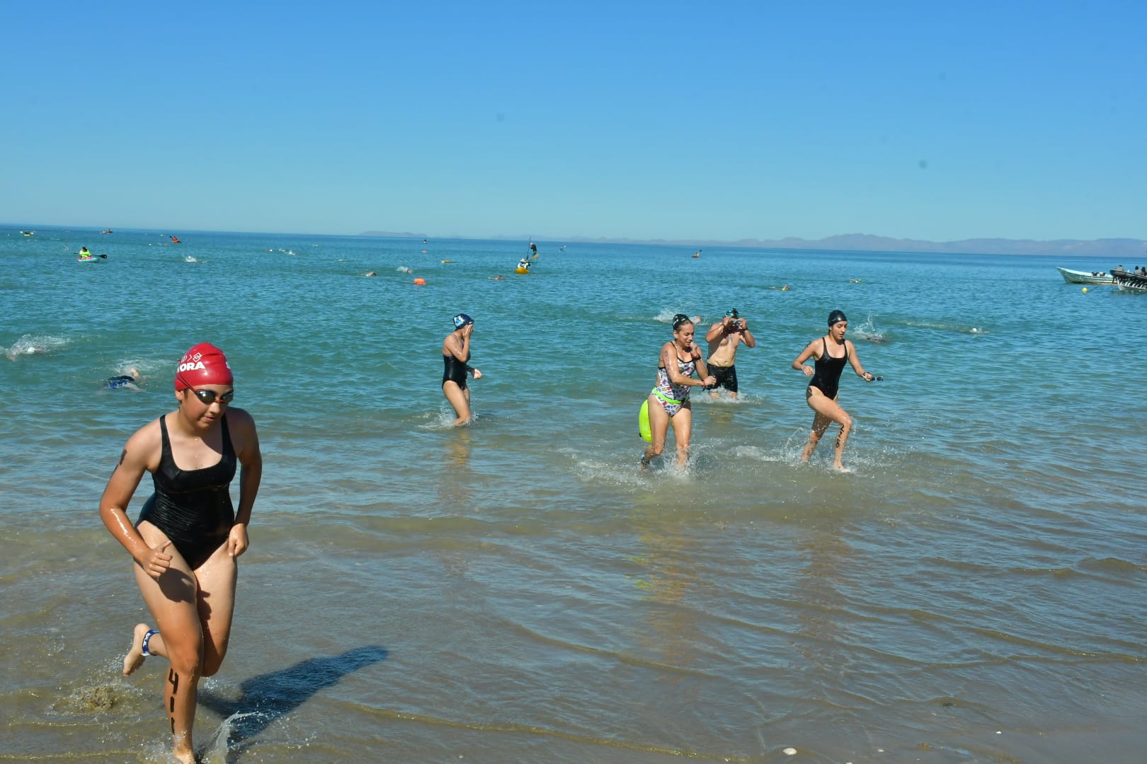 Hermosillo, Sonora; 19 de mayo, 2024.- Autoridades del Ayuntamiento de Hermosillo se sumaron este domingo 19 de mayo a cientos de personas de todas edades que se dieron cita en la playa del condominio Las Toninas en Bahía de Kino durante la competencia de nado Cruce de Bahía 2024.