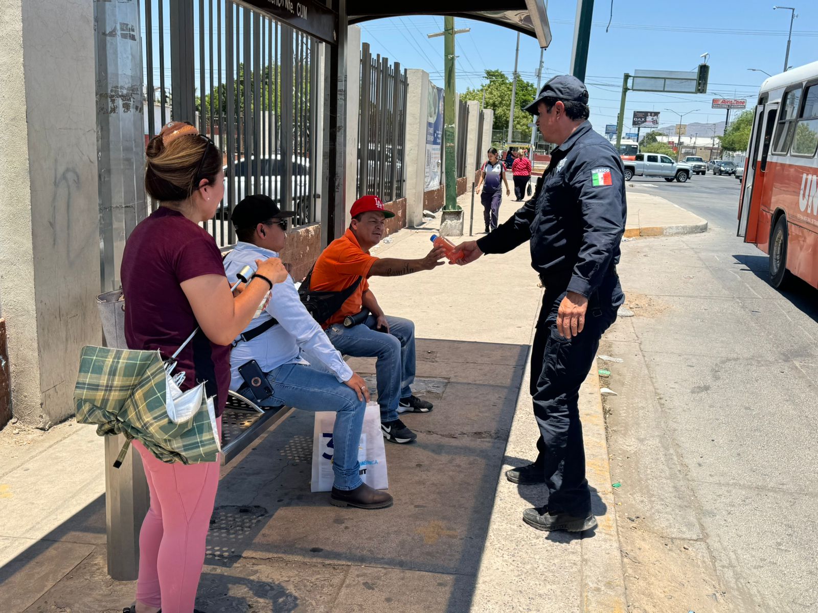 En operativo conjunto elementos de la Coordinación Municipal de Protección Civil, oficiales de la Jefatura de Policía Preventiva y Tránsito Municipal y jóvenes del Instituto Hermosillense de la Juventud atendieron a personas en distintas colonias, puntos de reunión y paradas de camión con botellas de agua y suero con el objetivo de hidratar a la comunidad, mismo que continuarán en los próximos días ante la alerta por ola de calor.