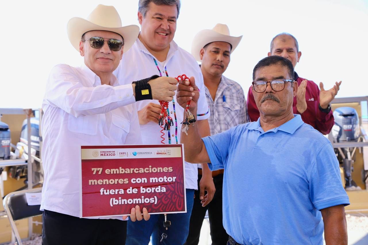 Las Guásimas, Sonora; 27 de agosto de 2024.- En cumplimiento al Proyecto Estratégico para el Desarrollo Pesquero para Justicia del Pueblo Yaqui, el gobernador Alfonso Durazo Montaño y el Comisionado Nacional de Acuacultura y Pesca (Conapesca), Octavio Almada Palafox, entregaron 77 embarcaciones y 77 motores fuera de borda, que en su conjunto forman un binomio, a pescadores de Las Guásimas con lo que suman 303 equipos con una inversión de 106.8 millones de pesos.