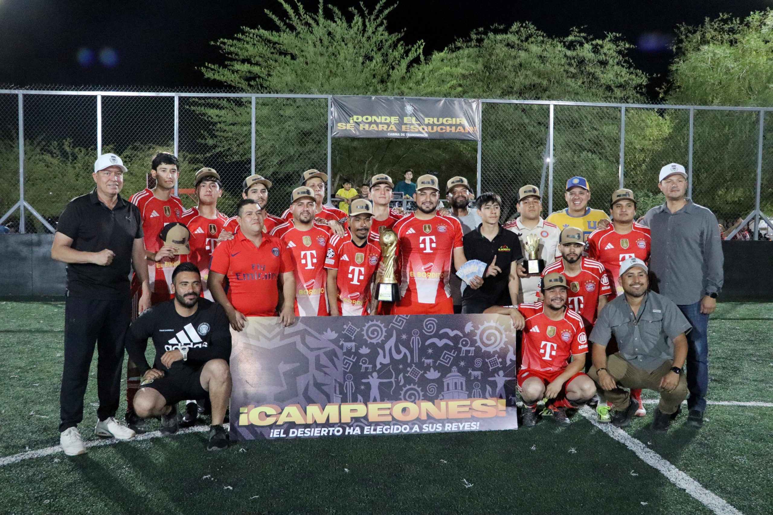 H. Caborca. – Esta liga se formó luego de que el alcalde Abraham “El Cubano” Mier hiciera entrega del nuevo pasto sintético en la cancha de fútbol 7 del parque de la 30, donde después y gracias a Ferrelectrica de Caborca y la liga Desert King Match, se remodelaron los cercos perimetrales y se instaló nueva madera en las paredes, entre otras mejoras. El recién renovado parque de la 30 fue testigo de la gran final de la nueva liga de fútbol Desert King Match, un torneo que ha capturado la atención de más de 200 jugadores.En esta primera edición, el campeón del torneo fue la escuadra El Bordito, quienes se llevaron una victoria contundente con un marcador de 5 goles a 3. Este triunfo les otorgó el trofeo de campeón, además de un premio monetario de 10 mil pesos proporcionados por la liga, más 5 mil pesos adicionales entregados por el presidente municipal, Abraham “El Cubano” Mier. Por su parte, Bayer de Altar recibió el trofeo de subcampeón y una bolsa de 5 mil pesos por parte de nuestro alcalde, reconociendo su destacada participación en el torneo.