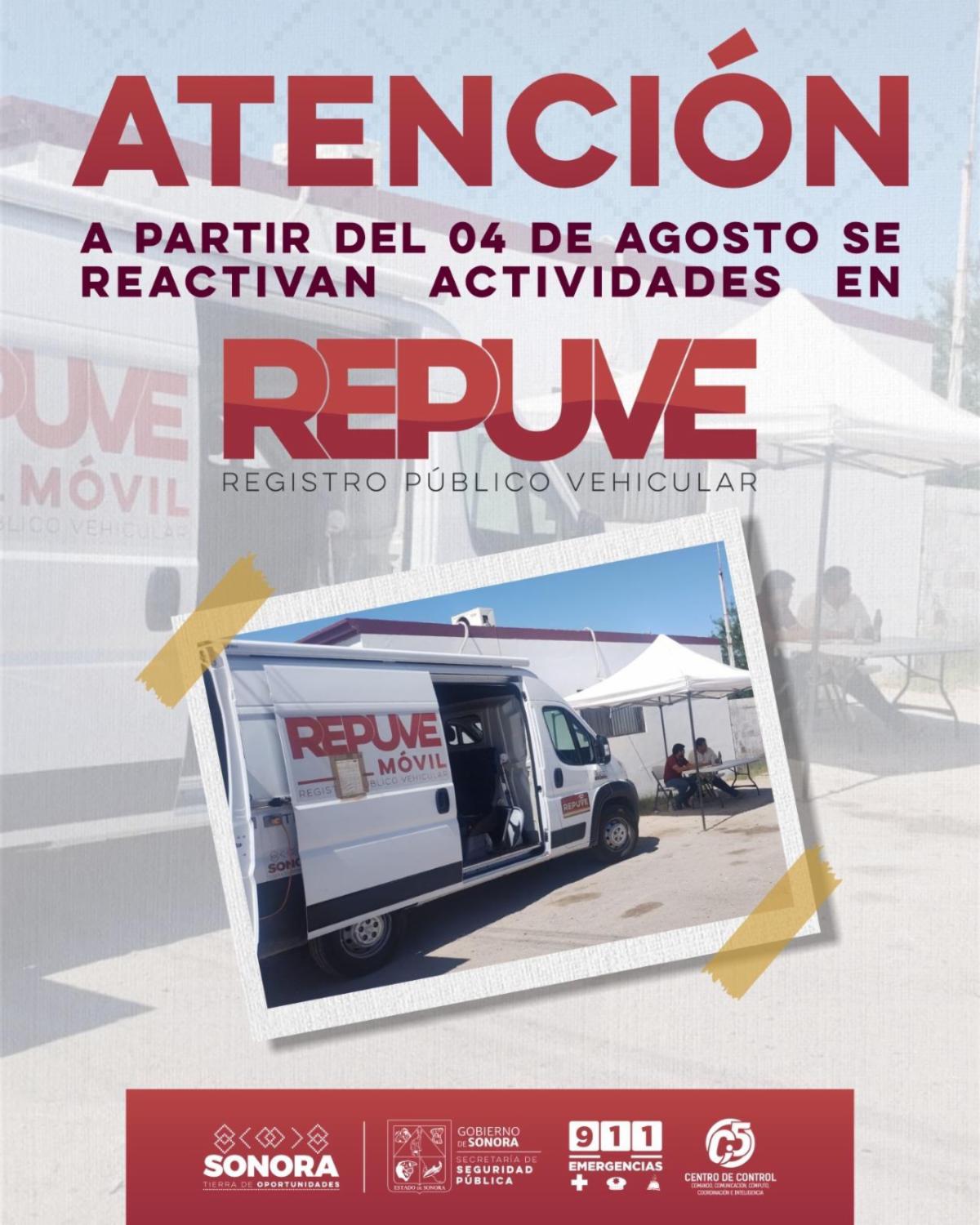 Hermosillo, Sonora; 21 de julio de 2025.- A partir del cuatro de agosto, el Gobierno de Sonora anunció que retomará el apoyo a la ciudadanía interesada en realizar el trámite de regularización de vehículos usados de procedencia extranjera, con la instalación de la unidad móvil en (municipio).El Registro Público Vehicular (Repuve), dependiente de la Secretaría de Seguridad Pública (SSP), coadyuva con las y los sonorenses, acercándose a sus localidades y facilitando el proceso que brinda certeza jurídica sobre la propiedad de sus vehículos.