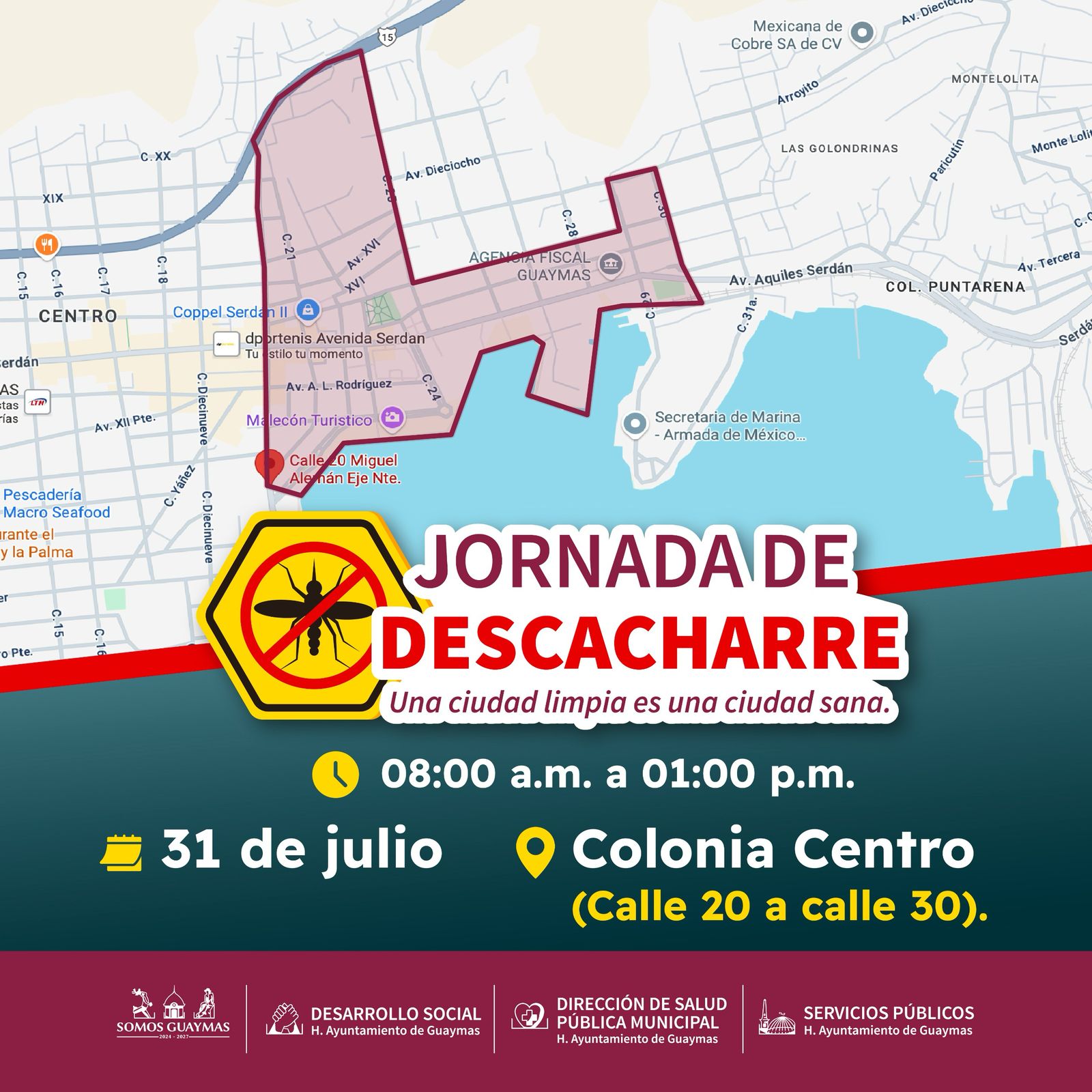Guaymas, Sonora, 29 de julio de 2025.- Como medida para prevenir enfermedades y mantener limpia la ciudad, este jueves y viernes el Ayuntamiento de Guaymas prepara Jornada de descacharre a través de Desarrollo Social, Salud Pública Municipal y Servicios Públicos Municipales.