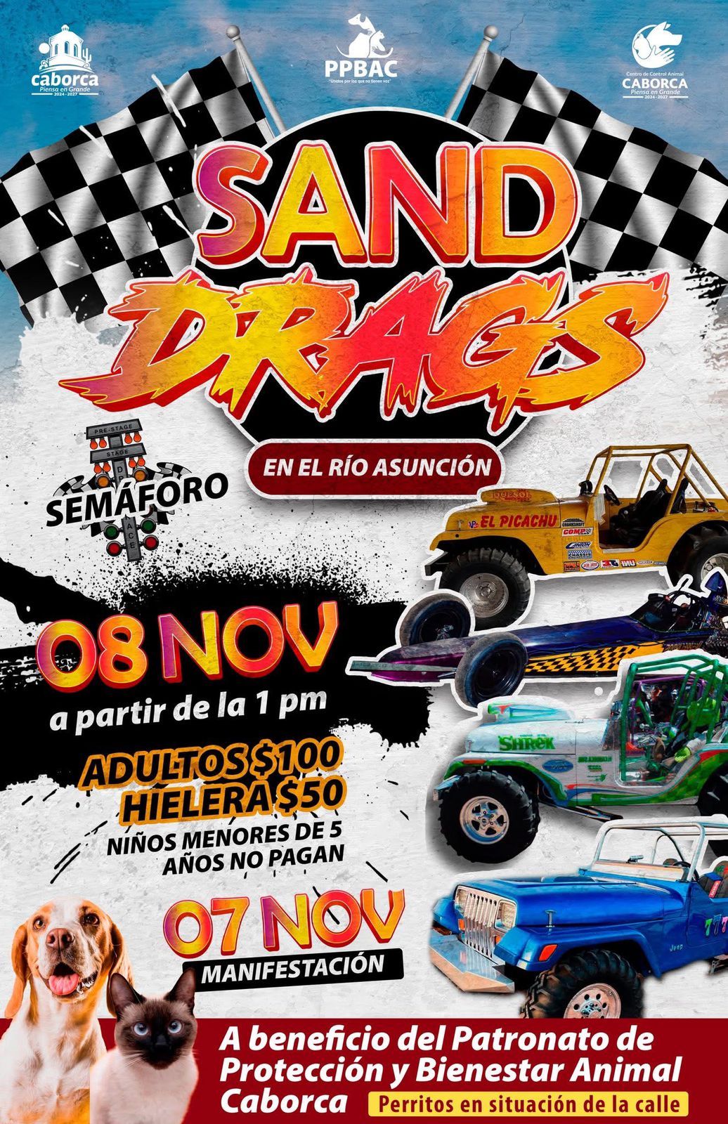 El sábado 8 de noviembre, a partir de la 1:00 de la tarde, se llevarán a cabo las competencias de Sand Drags en el Río Asunción. La entrada general tendrá un costo de 100 pesos por adulto, 50 pesos por hielera, y los niños menores de 5 años entran gratis.