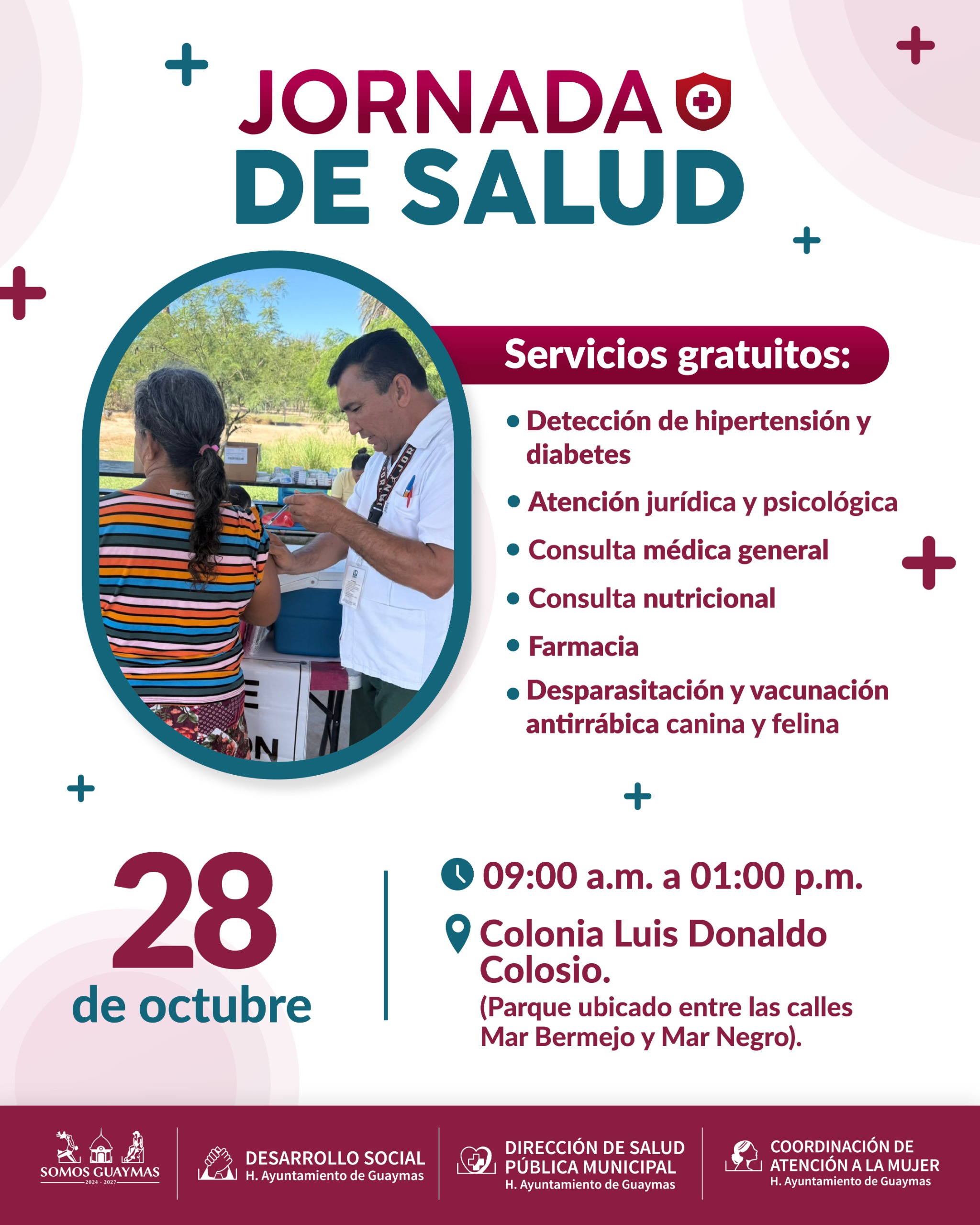 Guaymas, Sonora, 25 de octubre de 2025.- Para dar continuidad a las acciones preventivas en materia de salud que el Ayuntamiento de Guaymas realiza, este 28 de octubre en la colonia Luis Donaldo Colosio (Guaymas Norte, parque entre calles Mar Bermejo y Mar Negro) habrá Jornada de salud, anunció Austria Castro Gracia.