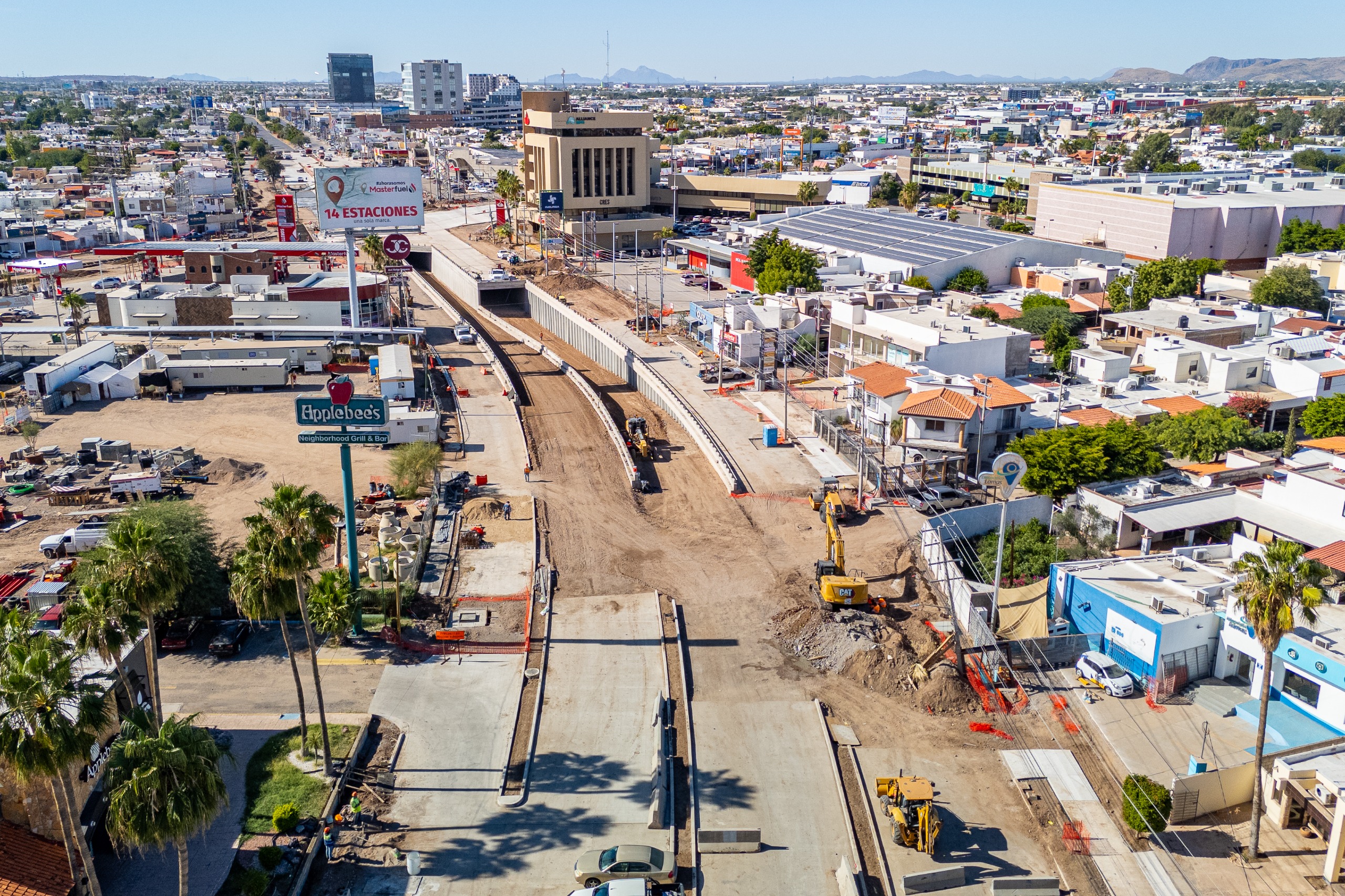 Hermosillo, Sonora; 29 de noviembre, 2025.- El paso a desnivel ubicado en el cruce de los bulevares Colosio y Solidaridad presenta un avance del 80 por ciento, obra que contribuirá a la movilidad en una de las zonas con mayor flujo vehicular en Hermosillo.La construcción a cargo de la Dirección General de Desarrollo de Infraestructura se encuentra en la fase de pavimentación, colocación de cables subterráneos y embellecimiento de camellones donde ya se han plantado árboles nativos que se adaptarán al suelo previo a la inauguración.