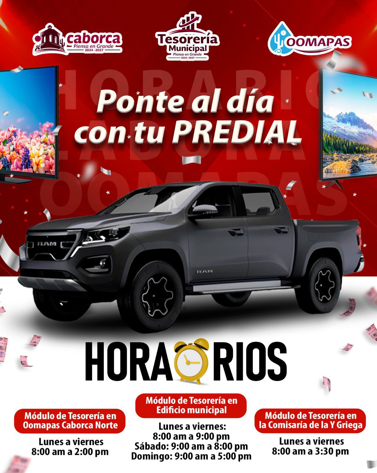 H. Caborca. – Poniéndote al día con tu Predial en enero, en automático tienes 5 oportunidades para ganarte un pick up RAM 1200 Bighorn Crew Cab 2026, televisiones y premios en efectivo.