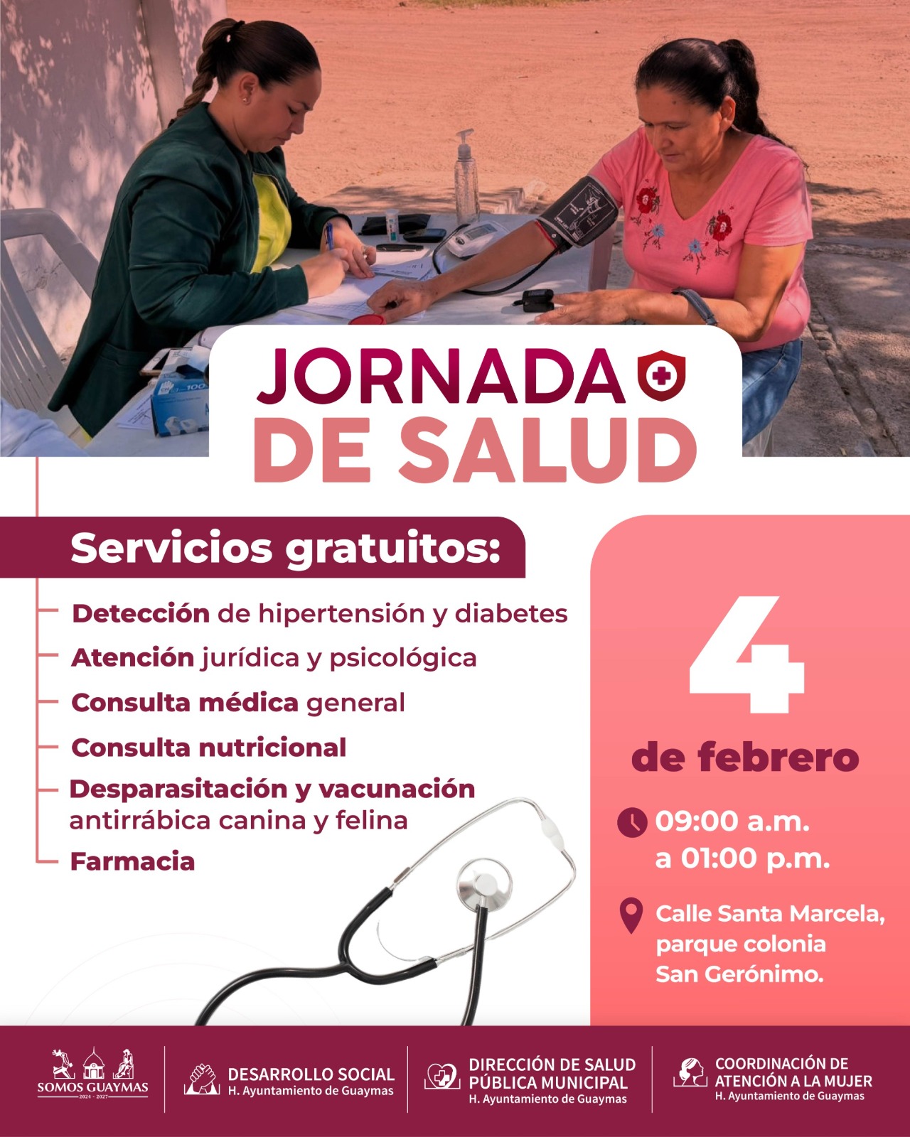 Guaymas, Sonora, 4 de febrero de 2026.- Como una alternativa para que las familias utilicen los servicios médicos que ofrece el Ayuntamiento de Guaymas y prevengan enfermedades, se prepara la visita en el sector San Gerónimo de la Jornada de salud el próximo 4 de febrero.