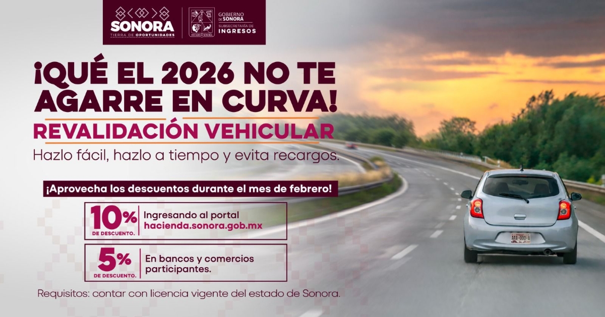 Hermosillo, Sonora; 9 de febrero.– El Gobierno de Sonora, a través de la Subsecretaría de Ingresos de la Secretaría de Hacienda, continúa ofreciendo descuentos para la revalidación vehicular 2026 durante los meses de febrero y marzo.