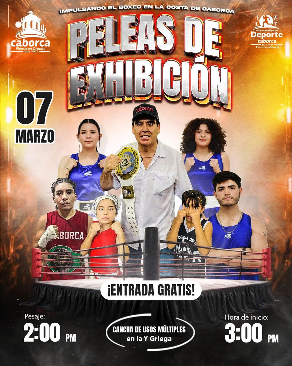 H. Caborca. 12 Febrero 2026-  Impulsando el talento local, el próximo 7 de marzo habrá una gran cartelera de “Peleas de Exhibición de Box” en la Y Griega.El evento tendrá lugar en la Cancha de Usos Múltiples del poblado, iniciando a las 2:00 de la tarde con el pesaje oficial de los pugilistas, para posteriormente dar paso a los combates a partir de las 3:00 de la tarde.